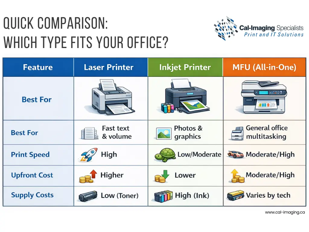 At Cal-Imaging Specialists, we have spent decades helping Calgary businesses find the perfect fit. Whether you are looking for a compact desktop unit or a specialized wide-format plotter, this guide breaks down the different types of printers to help you make an informed investment.