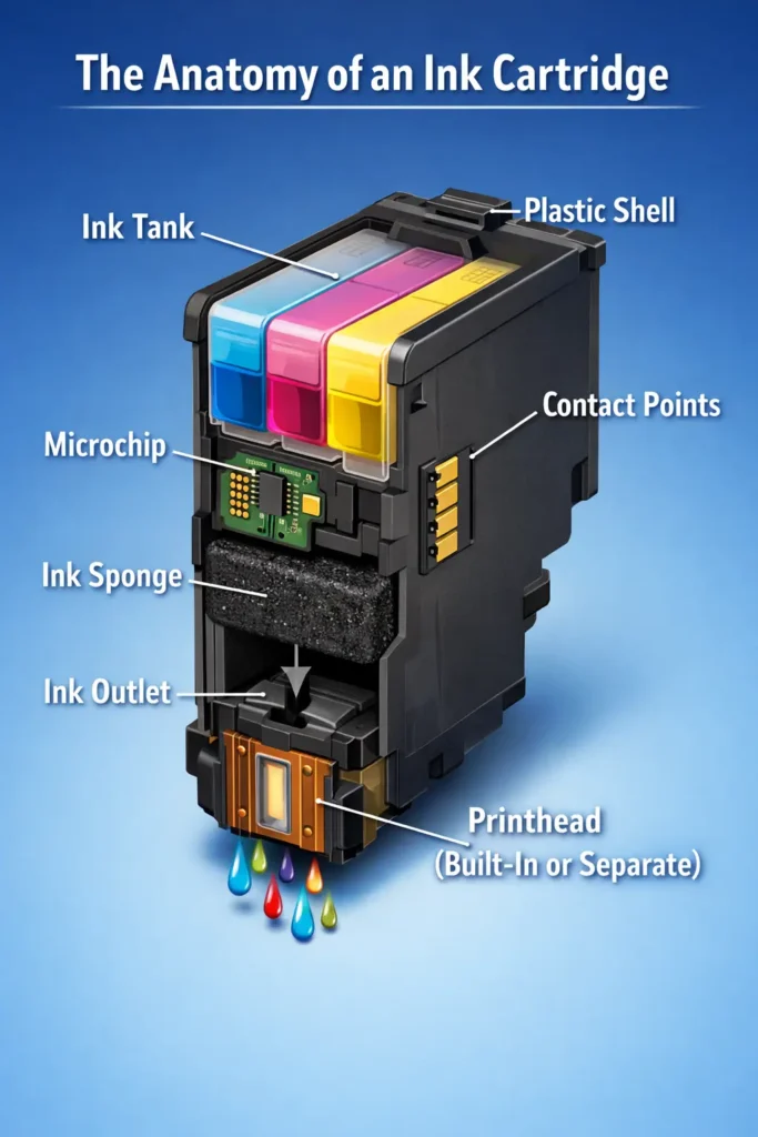 To truly understand what an ink cartridge is, it helps to look at its internal components. While designs vary by manufacturer, most cartridges contain the following parts: